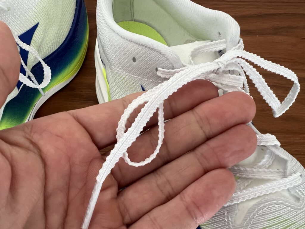 靴ひもは、アシックスのメタスピードシリーズと同じで軽量なギザギザ加工のもの。