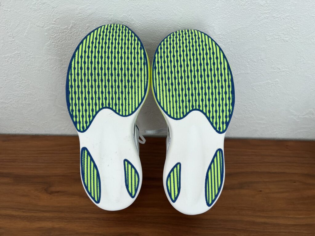アウトソールは、ミズノ特有の「ぶつぶつ」のやつ。前足部中心の配置で中側部やヒールは配置を最小限。