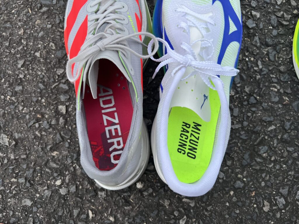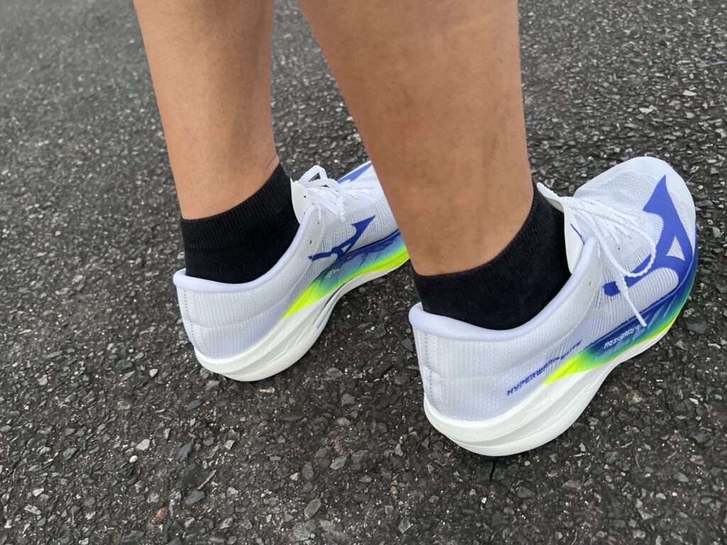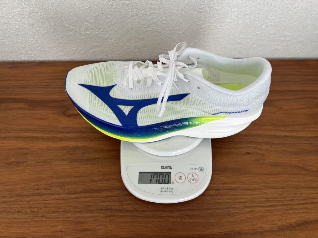 同じ170g台のアシックス「メタスピードTOKYO」シリーズと持ち比べましたが、ハイパーワープエリートは感覚としてかなり軽く感じました。
