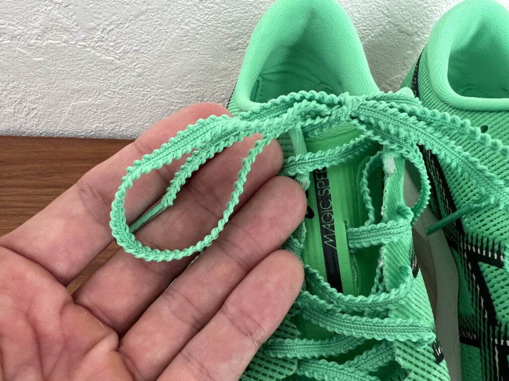 靴ひもは、メタスピードシリーズと同じで軽量なギザギザ加工のもの。