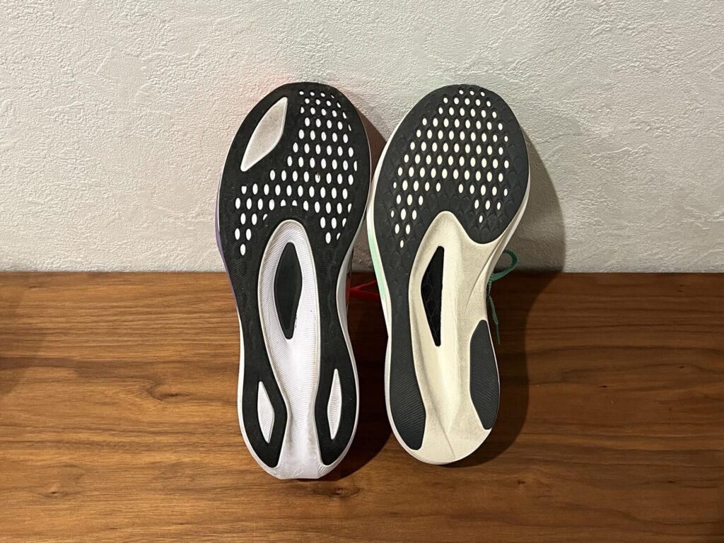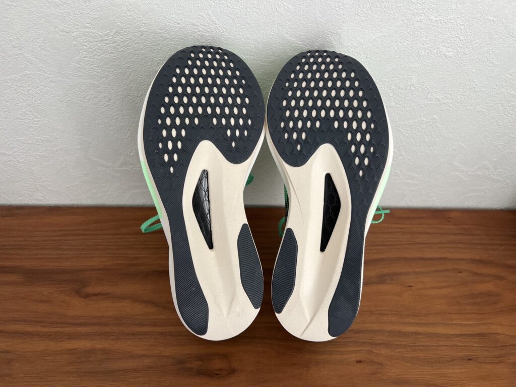 くわえて、接地されているカーボンプレートもやわらかめで反発はマイルド。前への推進というよりも、横方向への安ブレを安定させるためのような感じです。