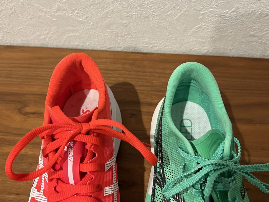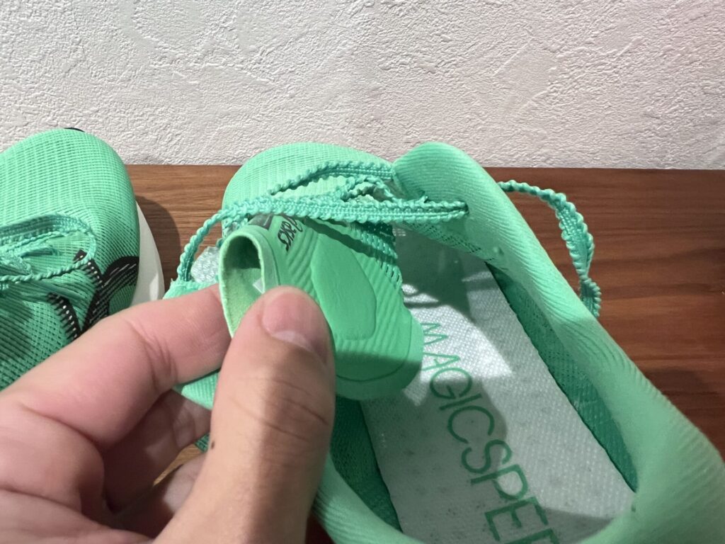 全体的に細身な作りのため、余分なスペースが生まれず履き心地はまずまず。マジックスピード4で感じた履き口の硬さもありませんでした。