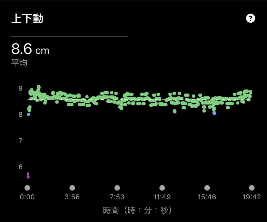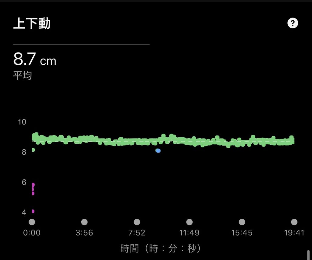 5000mを両シューズとも19分40秒(キロ3分56秒)で走り、ピッチや歩幅、上下動、接地時間をガーミンウォッチのグラフで比較してみました。