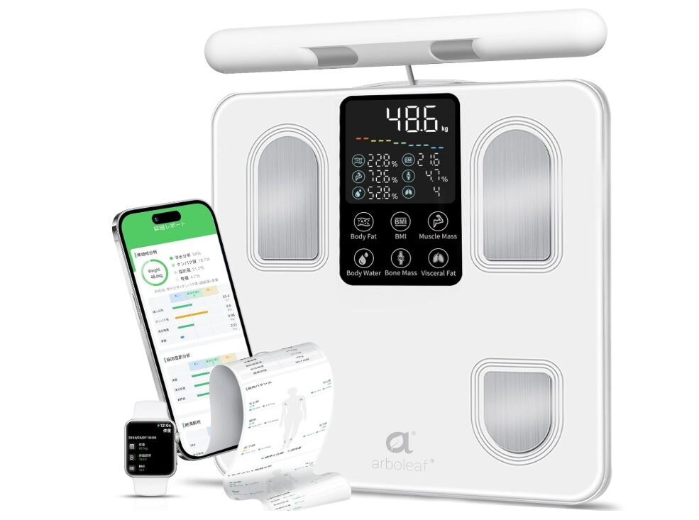 出典:Amazon.co.jp: arboleaf 体重計 体組成計・体脂肪計 カラダスキャン スマホ連動 データ自動転送 部位別測定 全身測定方式 体重/体脂肪率/BMI/筋肉量/26項目測定 8電極 Bluetooth対応 アプリ対応/apple watch/GoogleFit/Fitbit/appleヘルスケア連携 高精度/登録者無制限/自動認識 ヘルスメーター 電池付属 1年メーカー保証 : ホーム&キッチン