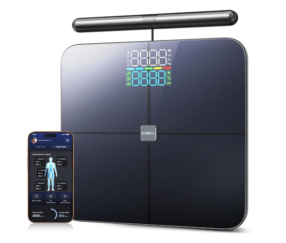 出典:Amazon.co.jp: DYKL AI×8電極 体重計 体組成計 スマホ連動 データ自動転送【体脂肪率/BMI/心拍数/筋肉量/基礎代謝量/水分量/体脂肪量/骨量/内臓脂肪/タンパク質/骨格筋量/皮下脂肪/3Dモデル】など56項目測定可能 カラダスキャン 自動ON/OFF ルスメーター Bluetooth ヘルスメーター 高精度 強化ガラス iOS/Android対応 日本語対応APP&日本語説明書付き : 産業・研究開発用品